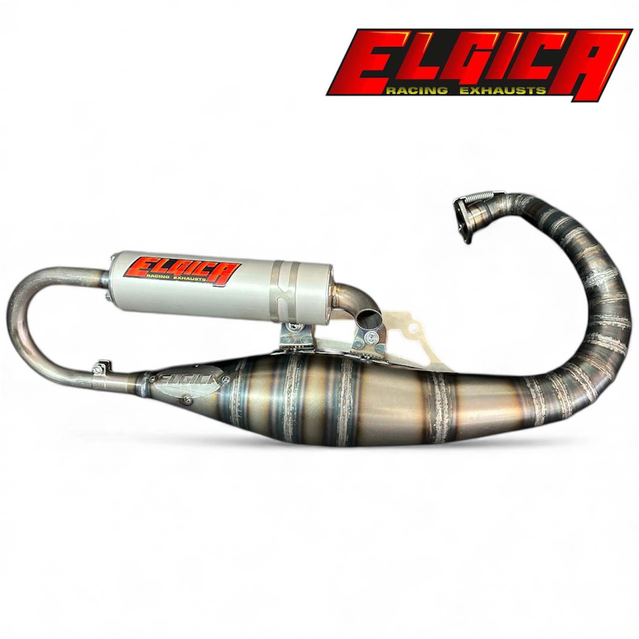 Marmitta Elgica Honda Dio Verticale per motori di cilindrata 70cc. Il kit comprende collettore di scarico 2 fori , molle, staffa, spillo, silenziatore anodizzato argento/nero con relativi accessori.